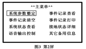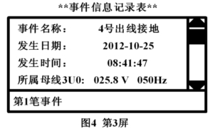 反白文字表示光標所在位置。在第2屏下,按“UP鍵”或“DOWN鍵”移動光標,按“FN鍵”退回上一級菜單,按“ENT鍵”進入所選擇的下一級菜單。由于“系統參數整定”內容較多,稍后進行詳細敘述,F在選擇“事件記錄查看”并按“ENT鍵”進入事件記錄查看頁面,如圖4所示。
