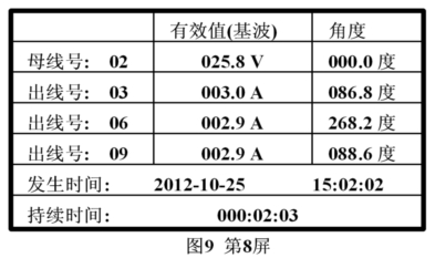 第8屏示例顯示了第6號出線接地時的接地狀態,其中零序電流****的三條出線分別是3、6、9,只有第6號出線的3I0(基波)和2段母線的3U0(基波)的夾角約270°,其余兩條的3I0(基波)和2段母線的3U0(基波)的夾角都約為90°。因此可以判斷是第6號出線發生了接地事故。假如在這種情況下2段母線有消弧線圈存在則顯示3UO和3I0的5次諧波之間的相位關系。