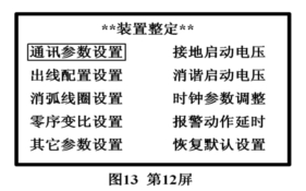 在第11屏下,輸入保護密碼0001后,按“ENT鍵”進入裝置整定選項菜單,如圖13所示。