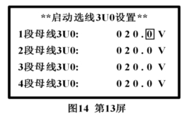 ◆ 在第13屏下,按“FN鍵”移動光標”,選擇要修改的數值位置(首先是“1段母線3U0”的數值) 按“UP鍵”或“DOWN鍵”修改該數值。